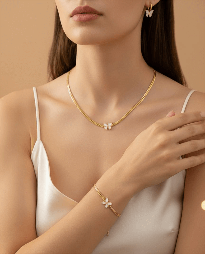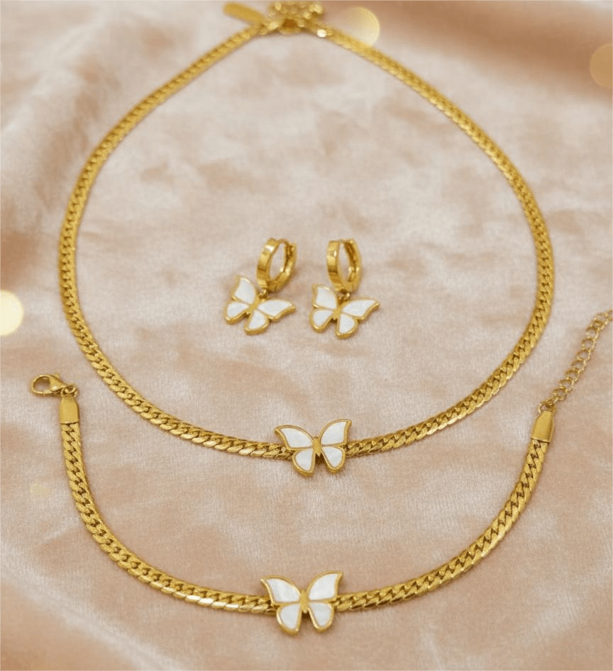 • This is a Gold-plated, snake chain white butterfly (3pcs Comboset). It includes Necklace, Earrings & Bracelet.