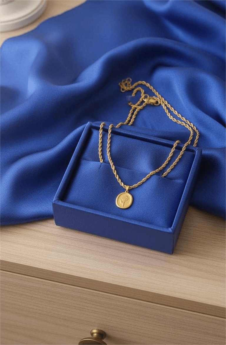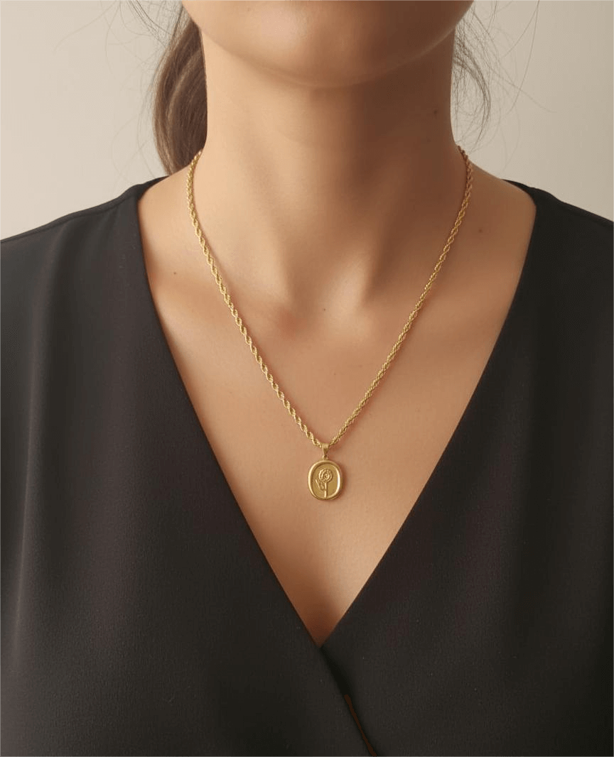 • This is a classic coin pendant necklace featuring a small, round, gold-toned charm with a rope chain.