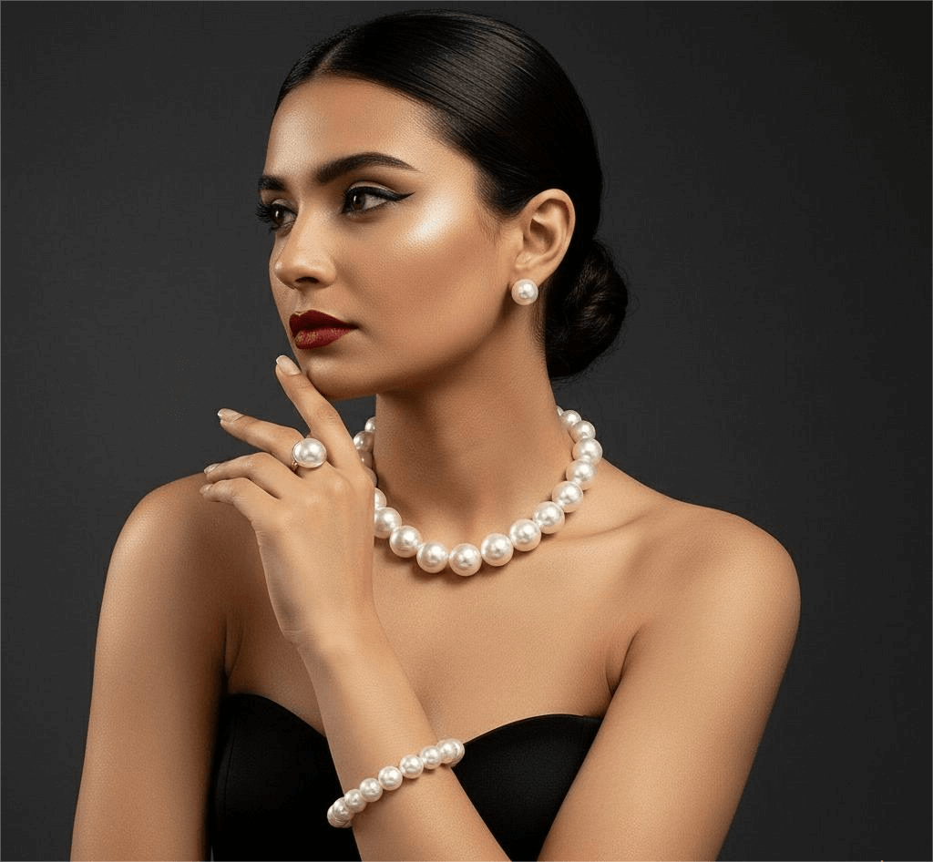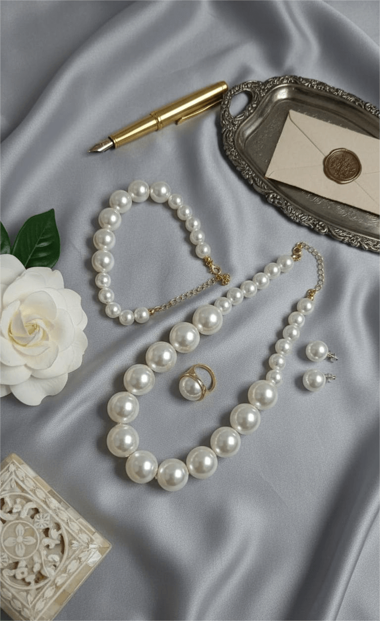 • Elegant high-end imitation pearl jewelry set featuring (4pcs Necklace, Bracelet, Earring, & Ring), crafted from alloy with a gold-plated finish.